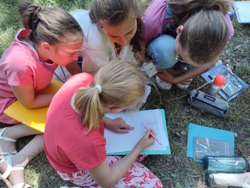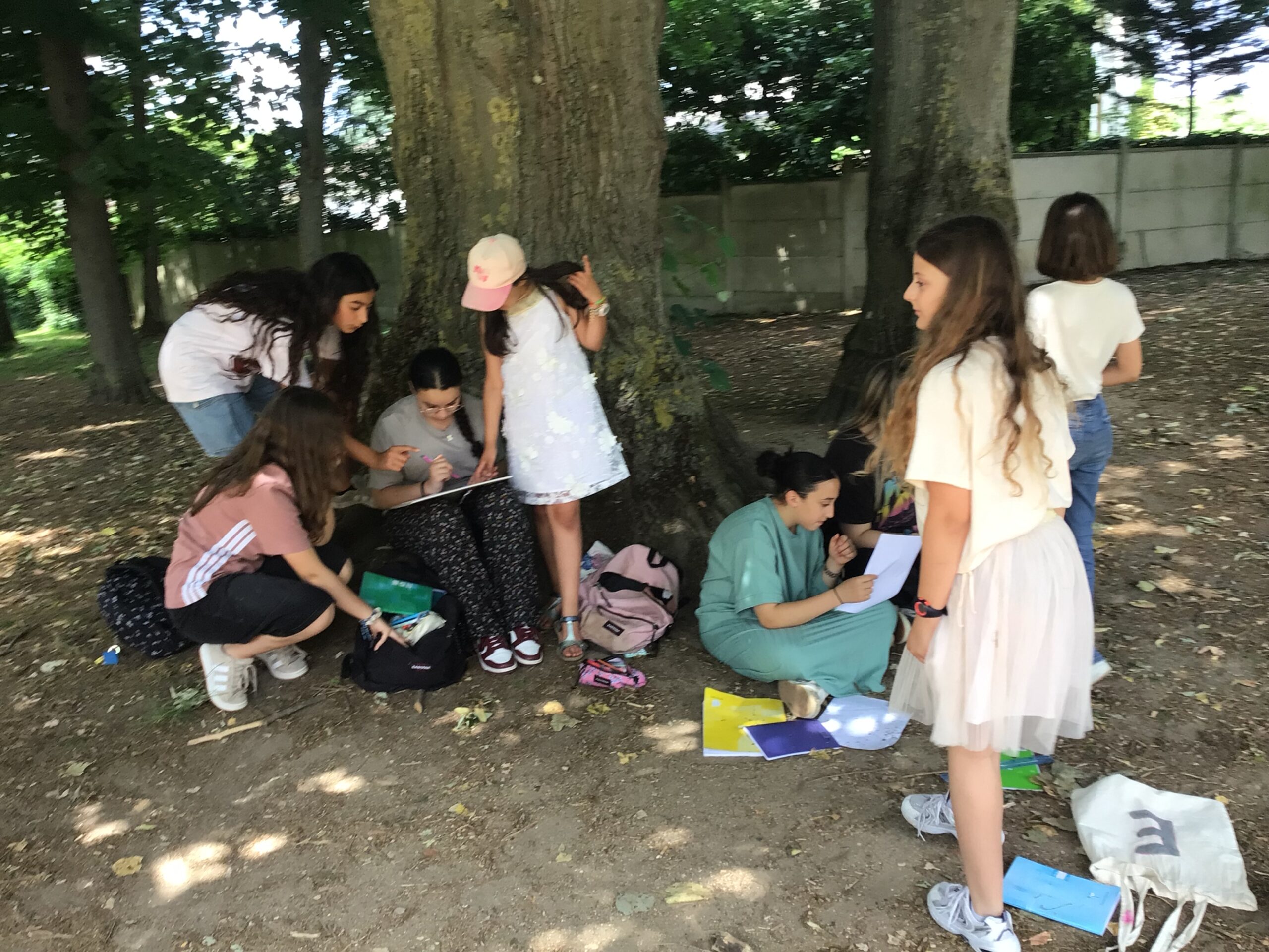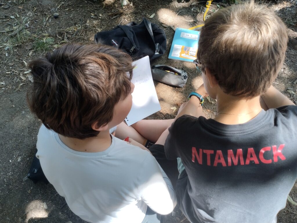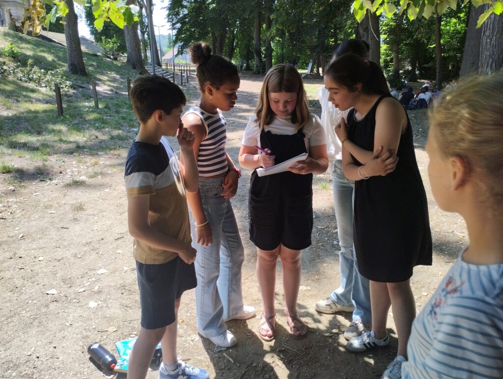 Trois jours plus tard, une » enquête au collège » était menée dans el parc. Les équipes mixtes ont planché sur des jeux réalisés en classe (quizz, mots-croisés, charades…) après la lecture des livres de la série » Enquête au collège « , tome 1 et 2.