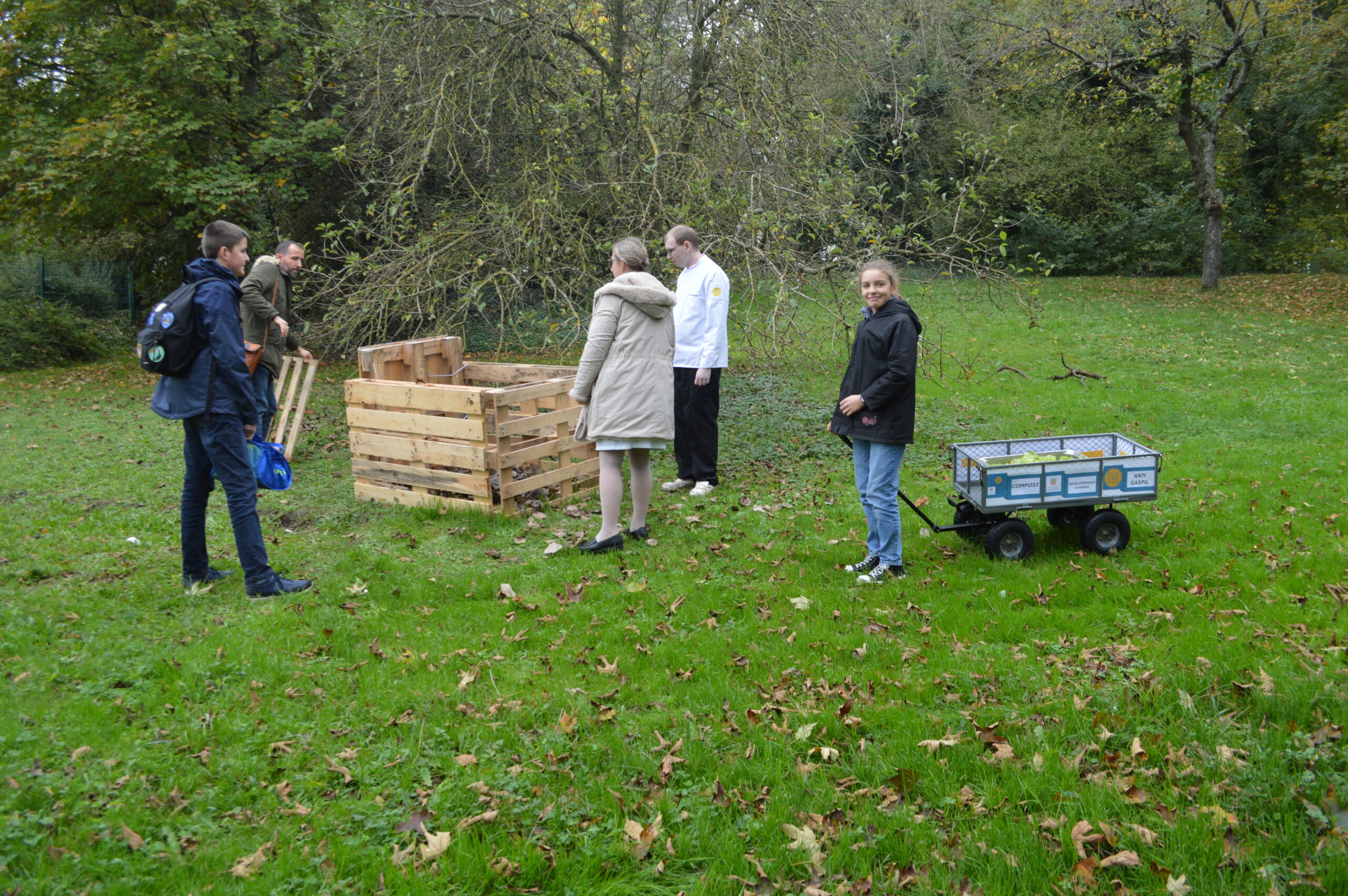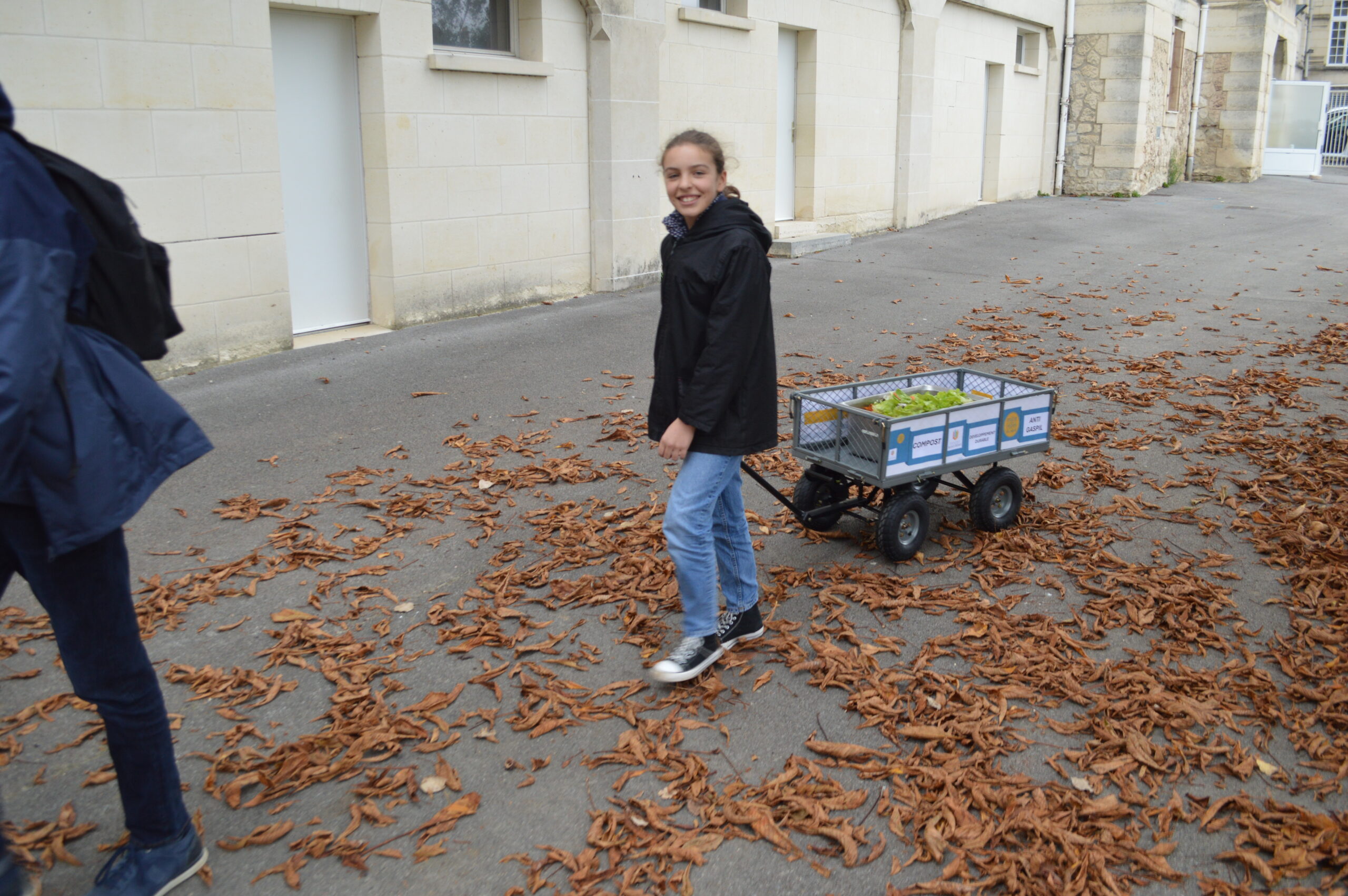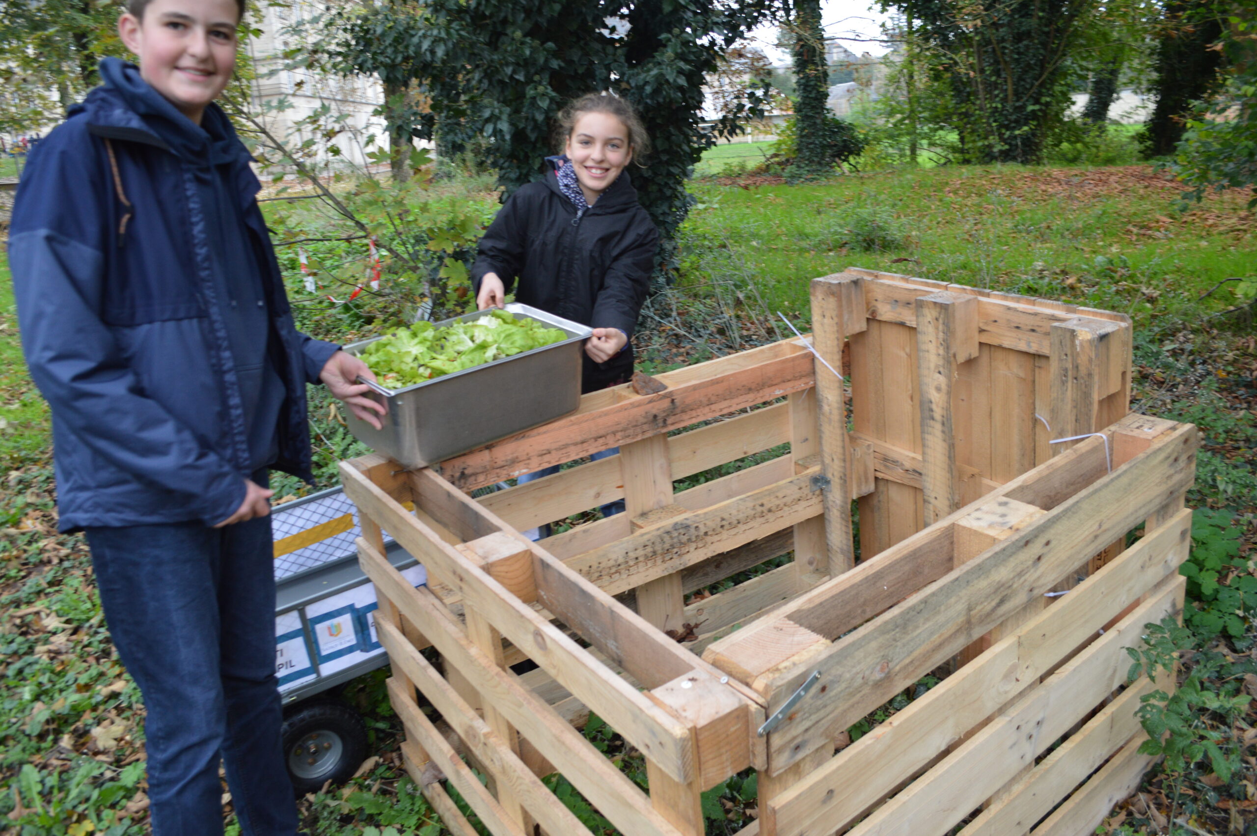 Ce composteur, fruit de deux séances de travail assidu, a pour mission de transformer les déchets organiques de la cantine en compost, qui pourra être réutilisé pour enrichir les sols. Dès aujourd’hui, les éco-délégués et les élèves de l’option biodiversité ont commencé à collecter les déchets organiques, mettant ainsi en œuvre le premier roulement de la collecte. Encadrés par M. Joly et Tony, membre de l’équipe de restauration, les élèves se rendent à la cantine durant la récréation de l’après-midi pour y collecter les déchets du déjeuner – déjà triés par les demi-pensionnaires – avant de les déposer dans le composteur.